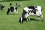 Black and white cow eating green meadow
