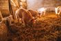 Close-up of a pig playing in a pigsty. Group of pigs.
